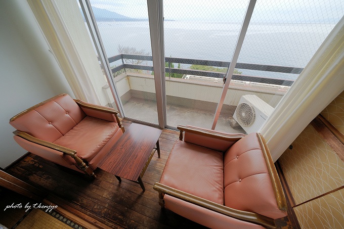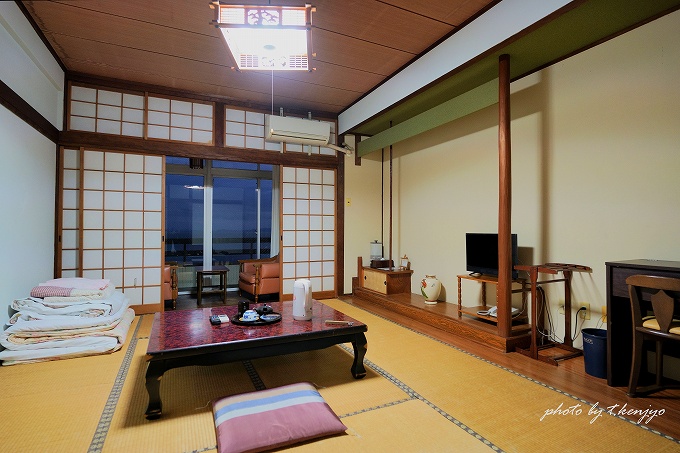 客室は全室オーシャンビューの和室。テレビ・インターネット接続・お茶セット・湯沸かしセット・洗浄機付きトイレは客室内に完備しており、一通りのものは揃っている印象です。