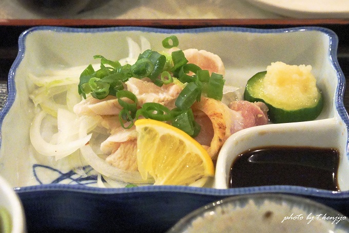 地鶏の刺身。コリコリとた舌触りで、薩摩の芋焼酎との相性抜群