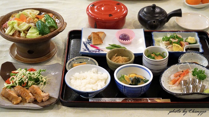 夕食は、地元鹿児島産の食材をふんだんに使った郷土料理。旬の食材を使うために、料理内容は季節によって変動します。全体的にボリューム満点で、大食漢の人でも満足できる品数でしょう。