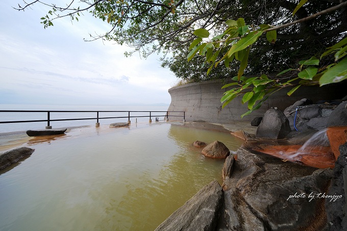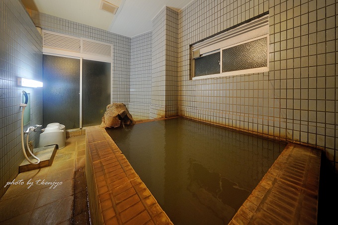 泉質名は「ナトリウム―塩化物温泉」。しかし単純な塩湯ではなく、鉄分と重曹成分を含有。そのために緑褐色(ウグイス色)のにごり湯であり、滑らかで重厚な肌触りに癒されます。また湯冷めしにくい泉質でもあり、浴後はしっとり&ポカポカと温もりが長時間持続。単に絶景温泉としてだけでなく、お湯そのものの良さにも注目すべきでしょう。