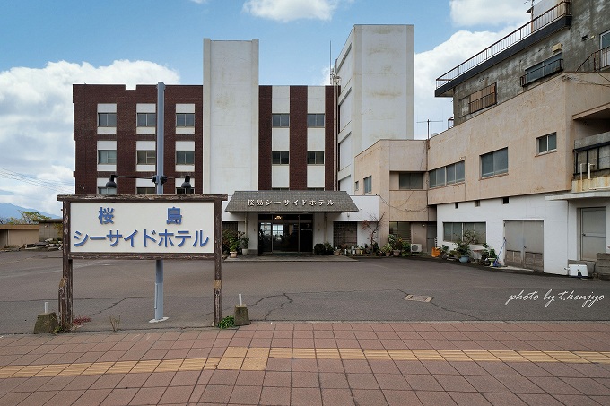 桜島シーサイドホテルの外観。どこか昭和風リゾートホテルの雰囲気漂います。