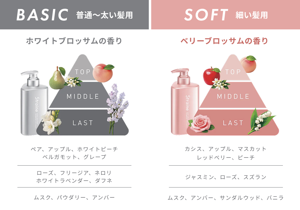 髪質にあわせた新たなラインナップとして新登場の細い髪用〈SOFT〉。成分をナノレベルまで微細化した「ストレートナノショット処方」を採用。髪内部への浸透力を高めることで、軽やかさを保ちながらうねりを整え、ふんわりとしたハリ・コシのある仕上がりに導きます。洗練された大人のベリーブロッサムの香り。