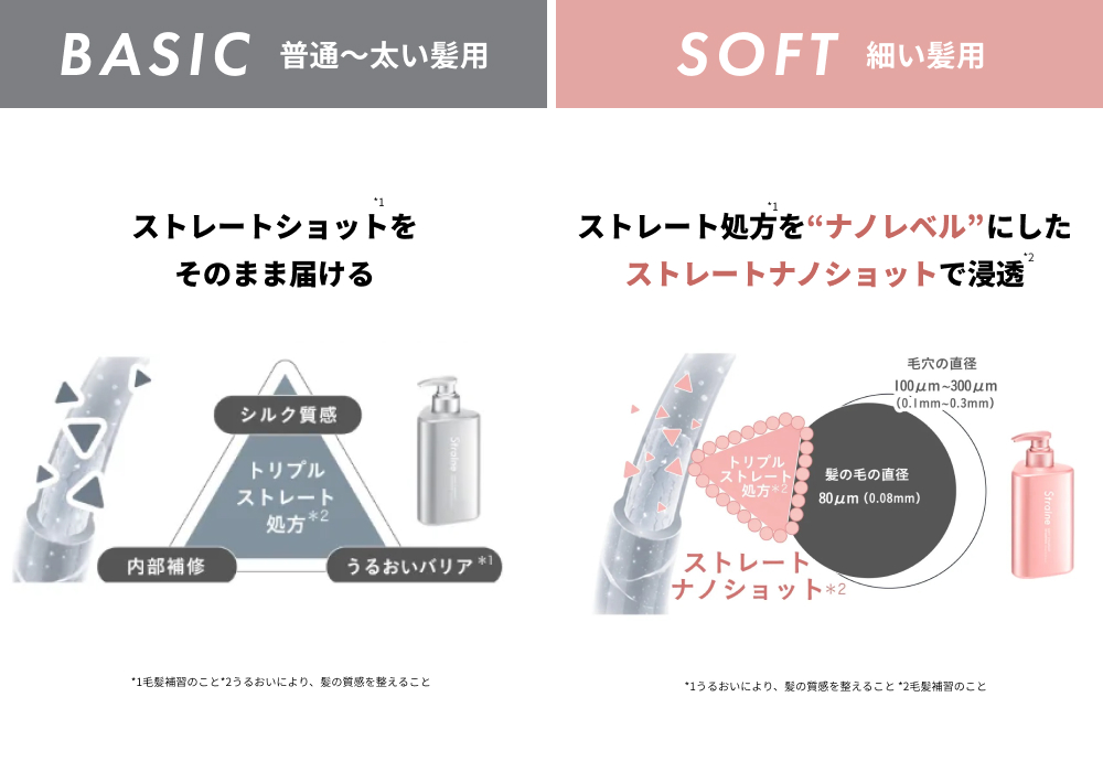 一方で、ダメージにより水分・栄養の流出が起こりやすく、「ペタッとしやすい」「立ち上がりにくい」という悩みが生じやすい細い髪には、ナノ化した「ストレートナノショット*1処方」で軽やかさを保ち、ふんわりとしたハリ・コシのある髪へ導く[SOFT]がおすすめです。