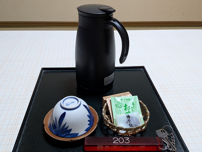 お湯の入ったポット、煎茶と玄米茶のティーパックが一個ずつ。お付菓子かわりの「種なし梅」まで。お湯がなくなったら廊下にあるので足してくださいとのことでした。