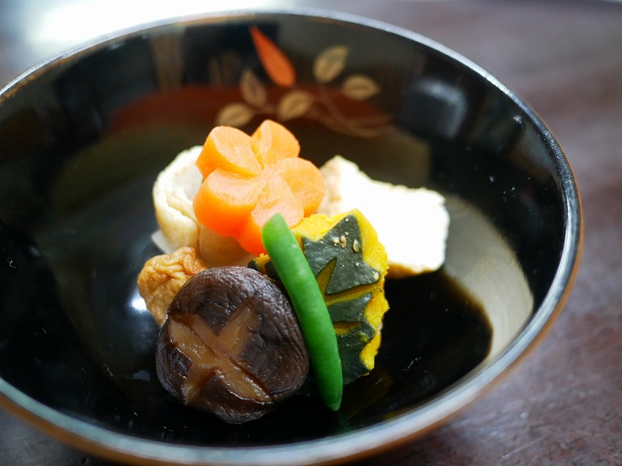 煮物には厚揚げや牛蒡を油揚げで巻いたもの、椎茸、人参、カボチャなどが彩り豊かに並び、海老のレンコンの蒸し物は優しい味の餡がかかった上品な逸品となっていました。