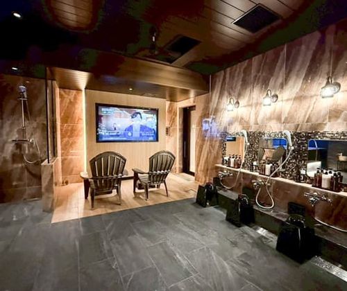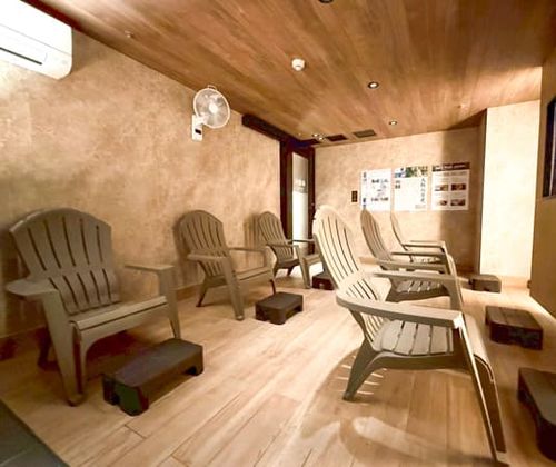 休憩室には、大画面のモニターやチェアがあり、お風呂上りにゆったりと過ごせます。