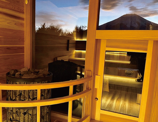 サウナ室内に流れる森の音やアロマの香りで、御船山の自然を感じる極上の入浴体験