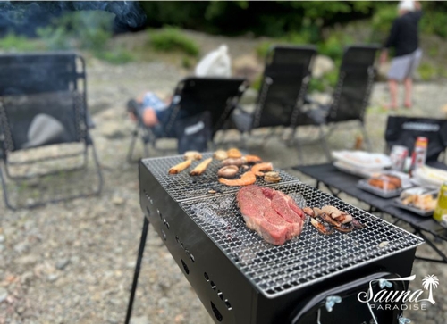 ×高瀬野キャンプ場敷地内にあるレンタルテントサウナ。川辺でのアウトドアサウナをお楽しみください。