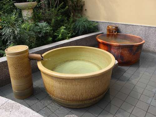 内湯を堪能した後はアルカリ性単純温泉の天然温泉が楽しめる露天風呂へ。まず目に入ったのは大きな浴槽。この日はオリーブ葉のお湯で、色や香りを楽しめました。他にもアロエやハッカ、シークワーサーのお風呂など、色々なハーブ湯が定期的に行われるそうです。何度行っても楽しめそうです。次に目につくのはプライベートに温泉が楽しめるつぼ湯。ナミナミと注がれるお湯に癒されます。