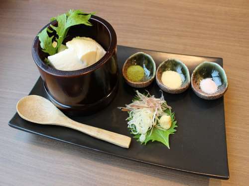 ひとつ目は1日限定20食という「手作り豆腐」。柚子・梅・抹茶の3種類の塩でいただきます。豆腐が甘くておいしかったです!