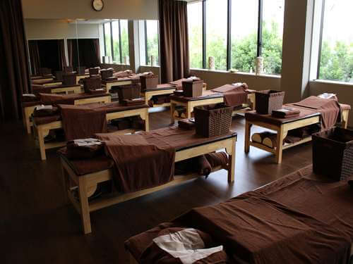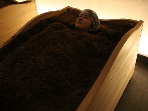 4Fにある「酵素浴」は全身で温かいヒノキのおがくずの中に約20分入ります。おがくずの温かみと香りが心地よく、じんわりと汗がたくさん出て、体の疲れが全部排出されたような感覚。まさにデトックス効果を感じました。カップルで受けることもできます。たくさん汗をかくので、お風呂に入る前に体験することをオススメしますよ!