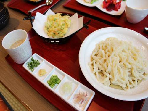 埼玉名物の加須うどん。5種類の薬味とごまダレでいただきます