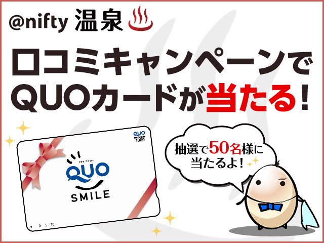 @nifty温泉に掲載されている施設の口コミを投稿していただいた方の中から、抽選で50名様にQUOカード 1000円分をプレゼントします!
